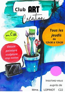 Si vous souhaitez profiter d’un temps au collège pour créer (dessiner, peindre modeler...) pour développer des projets personnels ou participer à des projets collectifs, inscrivez vous au club art et création les jeudis de 12h30 à 13h20.